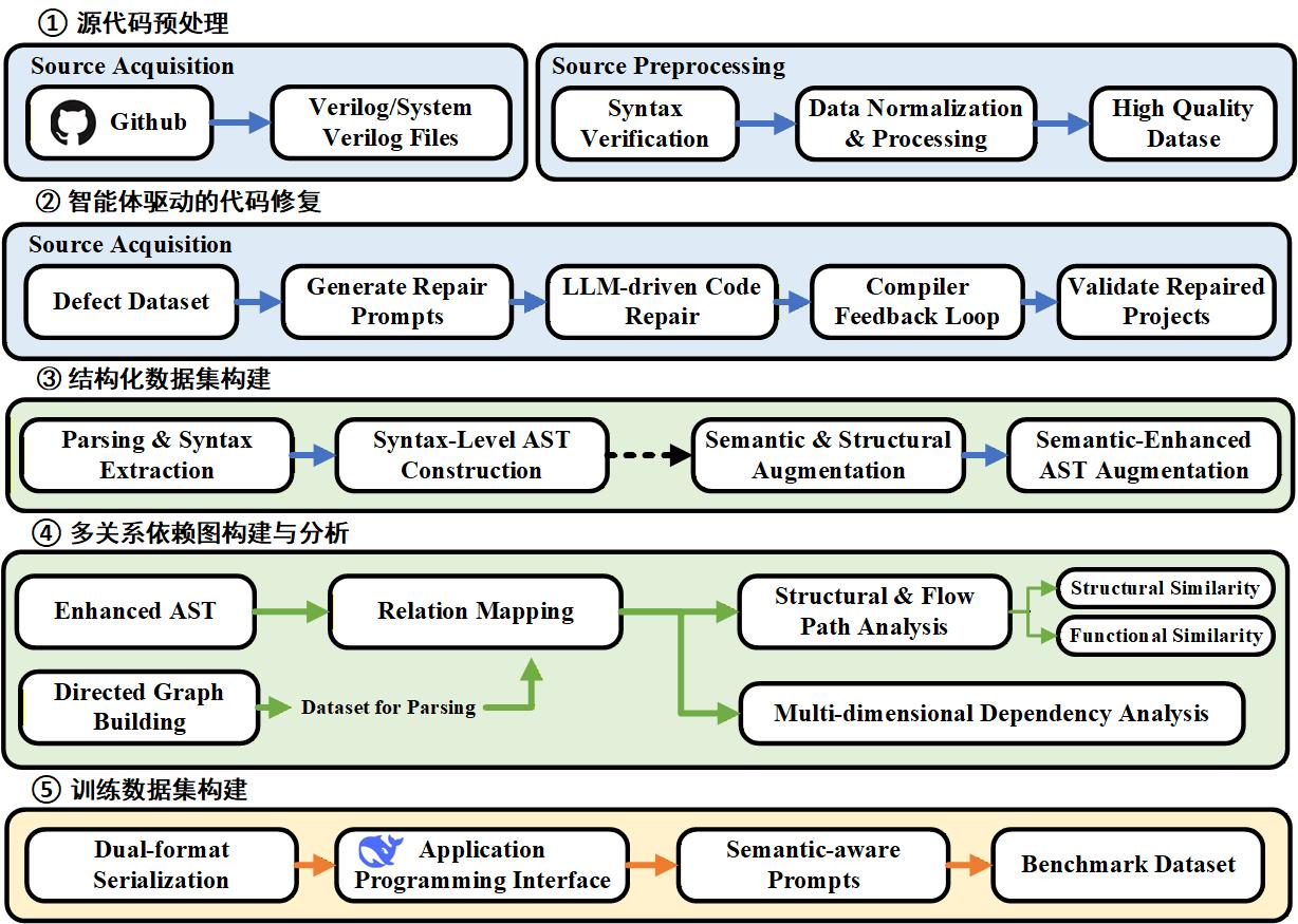 近日,太阳城app 郭宇锋教授团队在ACM International Conference on the Foundations of Software Engineering (FSE) 2026 发表创新研究成果“VerilogASTBench: Benchmark Construction of Verilog AST Dataset with Dual-Stage AST Semantic Enhancement Framework” 第一作者为张鲁萍博士,通讯作者为严大鹏老师。该研究针对Verilog代码生成过程中高质量、大规模训练数据集缺失导致语法与功能正确性不足的问题,提出了一种基于抽象语法树的语义增强技术,用于构建高质量的Verilog数据集。该研究从GitHub开源代码库中收集了1,035,777条Verilog代码样本,并对进行数据清洗,最终构建了包含318,021条高质量样本的Verilog数据集。实验结果表明,在该数据集上微调后,CodeQwen-7B在 Verilog 代码生成任务中的准确率提升9.02%,并在 VerilogEval 基准上优于 GPT-4。
