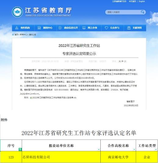 根据江苏省教育厅2022年8月发布《2022年江苏省研究生工作站专家评选认定结果公示》,确定了评选认定结果名单,其中我校与芯昇科技有限公司联合申报的“2022年江苏省研究生工作站获批成立。