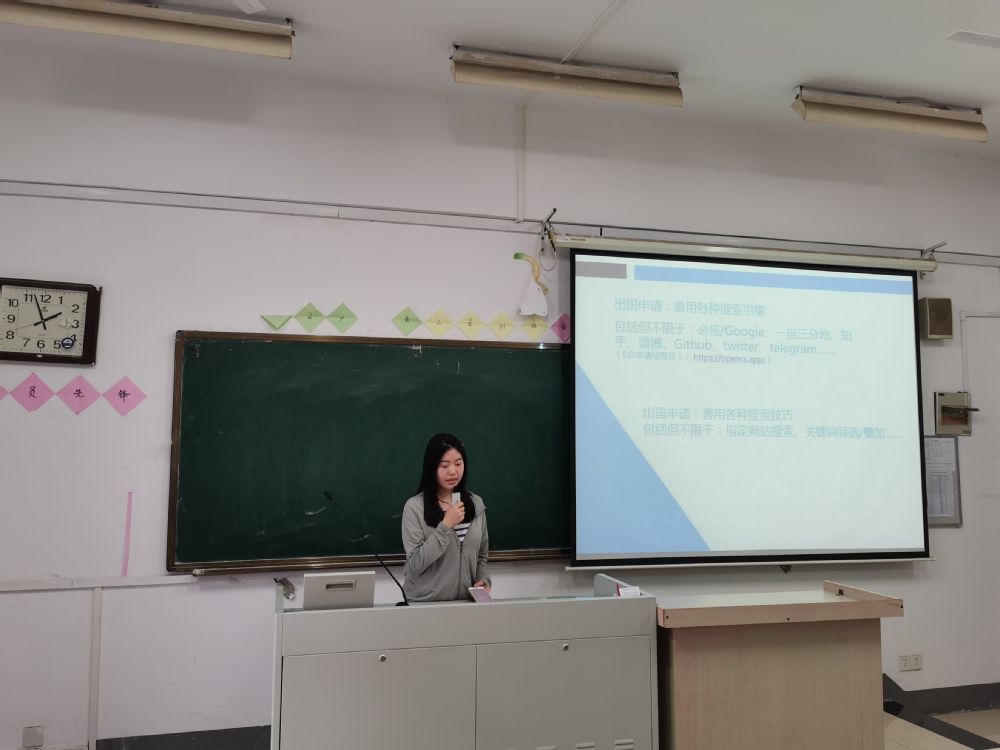 会上,阮小芙同学从经验分享、时间规划、申请材料和选校策略四个方面就出国留学经验进行了分享。她系统地总结了选校的相关事项,从自身经历出发分析了留学是否需要选择中介的问题。同时,她结合自身的择校经验,强调考取GRE的重要性。此外,她为同学们择校提出了包括多方参考胜过相信权威在内的7条建议,并对同学们提出了发挥主观能动性、多思考多回忆、积极和同伴交流3点要求。