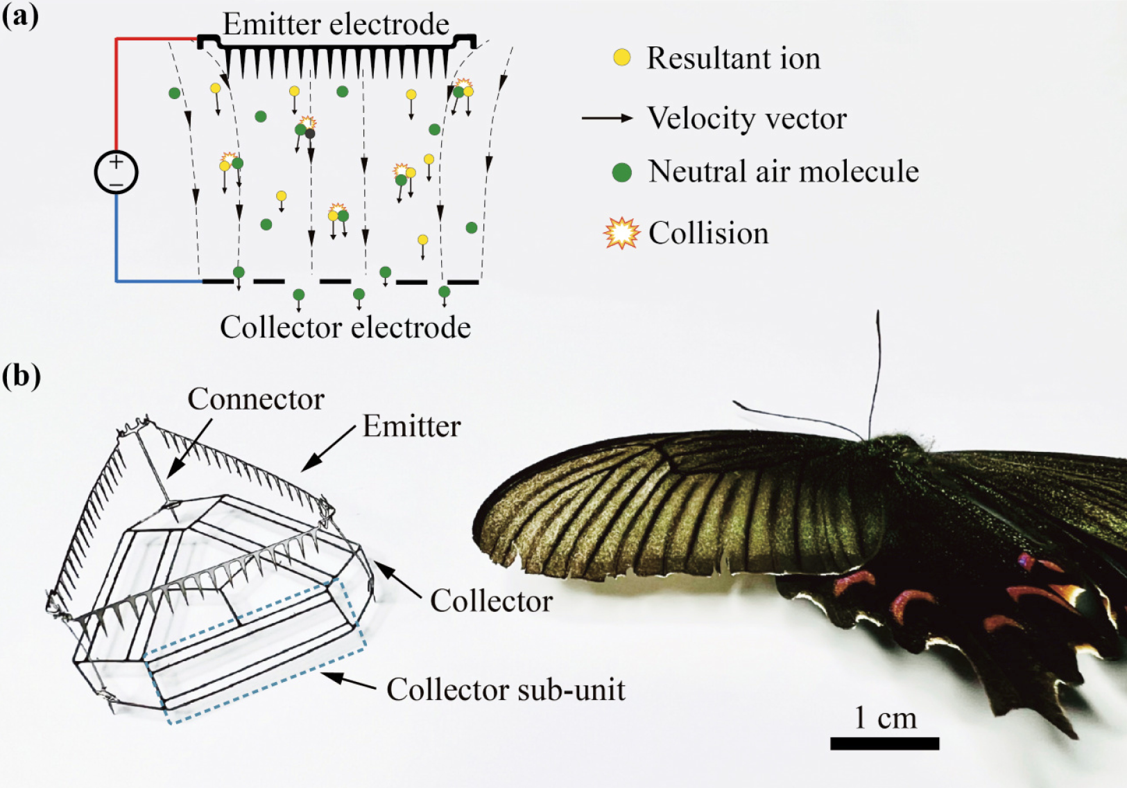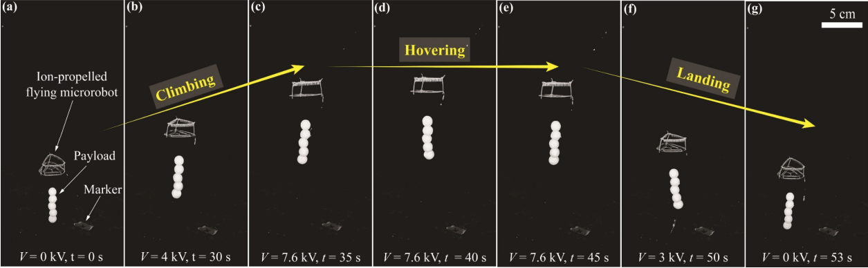 论文《Microrobotic Flight Enabled by Ultralight Ion Thrusters with High Thrust-to-Weight Ratio and Low Fabrication Cost》展示了团队在微型飞行机器人领域的最新研究成果。论文通过理论、多物理场建模和实验验证相结合的方法,创新研制了一种基于离子推进的体积小、质量轻、推重比大、成本低的新型微型飞行机器人。该机器人具有巨大的工程应用价值,可用于灾后救援、军事侦查、大型建筑物监测、探月工程等领域。论文第一作者为太阳城app 硕士研究生顾洋,蔡先法副教授为并列第一作者,通讯作者为郭宇锋教授、李巍教授。太阳城app 为论文第一署名单位。