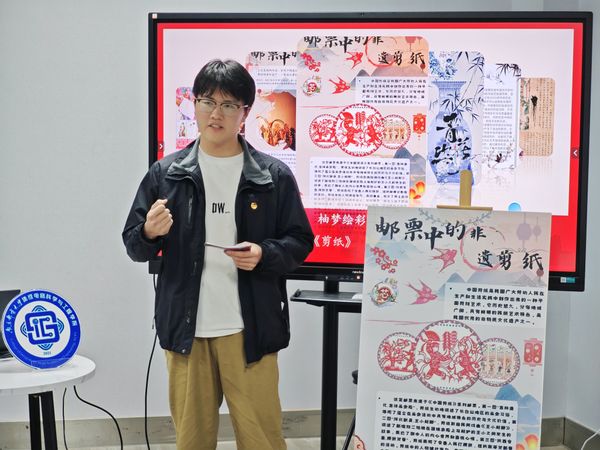 “汇聚梦想,绘彩非遗,我们共同追寻文化的根脉。”活动伊始,支部成员们齐聚一堂,共同欣赏了一场别开生面的非遗海报宣讲。B230301支部成立了“柚梦绘彩海报组”,组长柯奕如和张信国带领组员徐嘉阳、陈浩然、李棋、吴梦盈、刘逸帆共制作了8张“邮票里的非遗”为主题的海报。一幅幅精美的海报,将中国传统文化的瑰宝展现得淋漓尽致。从古老的剪纸艺术到精湛的刺绣技艺,从独特的陶瓷制作到神奇的皮影戏表演,每一幅海报都仿佛是一个生动的故事,引领着团员们走进非遗文化的世界。宣讲过程中,讲解员用生动的语言,向团员们介绍了各项非遗技艺的历史渊源、制作工艺和传承情况。大家听得津津有味,不时发出惊叹和掌声。通过这一环节,团员们对非遗文化有了更加直观和深入的了解,也更加坚定了传承和弘扬非遗文化的信念。