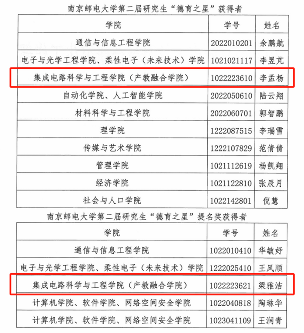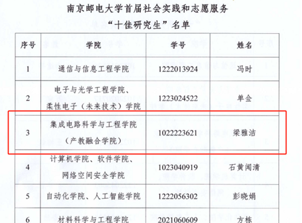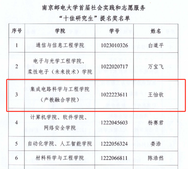 太阳城app 南邮“芯”力量、“知芯”实践团荣获南京邮电大学首届社会实践和志愿服务“十佳研究生团队”,李孟杨同学获南京邮电大学第二届研究生“德育之星”;梁雅洁同学获南京邮电大学首届社会实践和志愿服务“十佳研究生”及“德育之星”提名奖;王怡钦同学获南京邮电大学首届社会实践和志愿服务“十佳研究生”提名奖;舒林聪、黄耕同学获南京邮电大学2024年研究生“励志之星”提名奖。