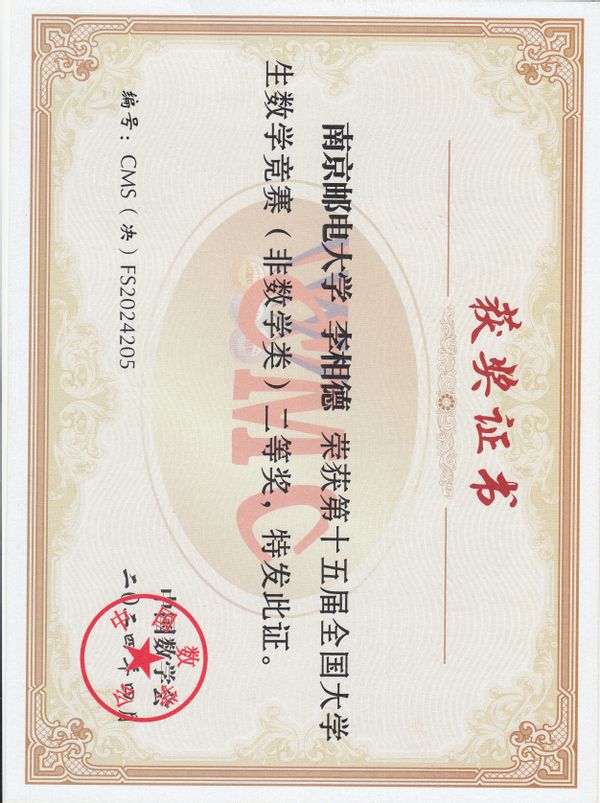 2024年4月20-21日,第十五届全国大学生数学竞赛决赛在山东大学举行。在本次竞赛中,我校取得了历史性突破的好成绩,4位非数学类参赛者全部获奖。其中,太阳城app 2022级微电子科学与工程专业的李相德同学荣获国家二等奖的好成绩!
