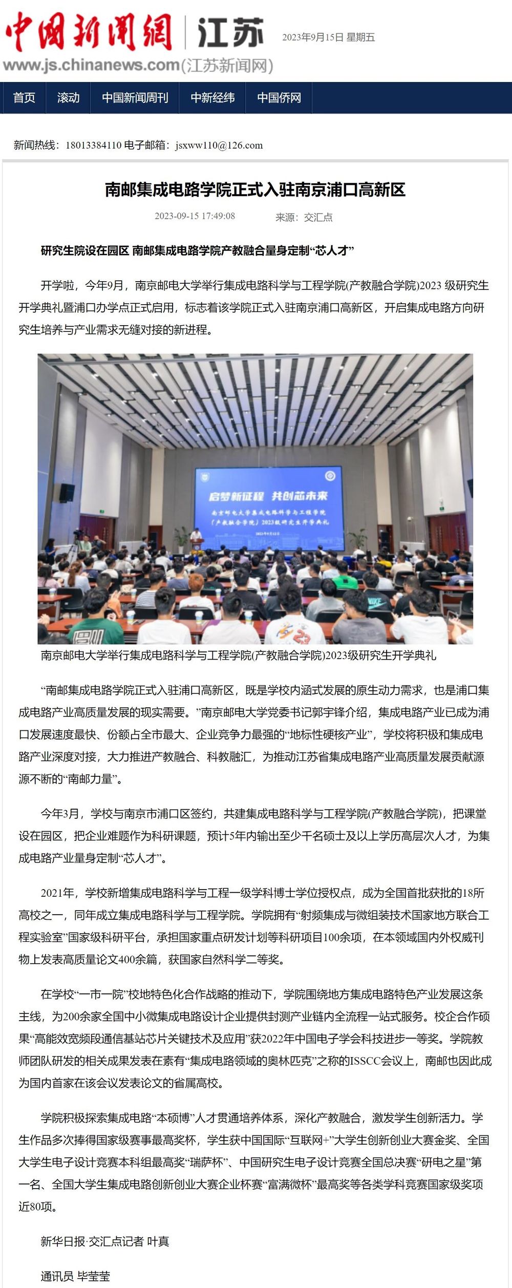【中国新闻网】南邮集成电路太阳城app 正式入驻南京浦口高新区