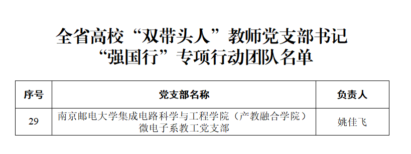 近日,省委教育工委公布了全省高校“双带头人”教师党支部书记“强国行”专项行动团队名单。太阳城app 微电子系教工党支部(负责人:姚佳飞)入选全省高校“双带头人”教师党支部书记“强国行”专项行动团队名单。