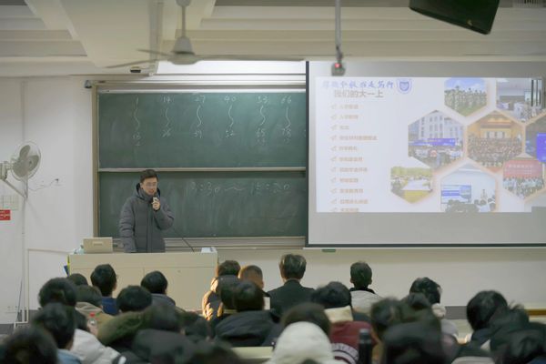 会上,范老师通过照片围绕新生报到、入学教育、学风建设、班级建设、安全教育等本学期重点工作进行总结回顾,引领着同学们一同回溯大学第一学期的生活学习点滴历程,每一张照片都是承载着满满的回忆,每一帧画面皆彰显出同学们积极进取的精神风貌。他充分肯定了同学们在大一学年取得的各方面成绩,也指出了各班在不同方面存在的优势和不足,希望各班要认真总结并向表现优秀的班集体看齐,互相学习、取长补短、争先创优。在新学年里,他鼓励同学们要坚持晨跑和晨读,培养自律的良好习惯,提高自理和自立能力。同时,要继续保持积极向上的学习态度,勇于探索未知领域,不断提升和突破自我。