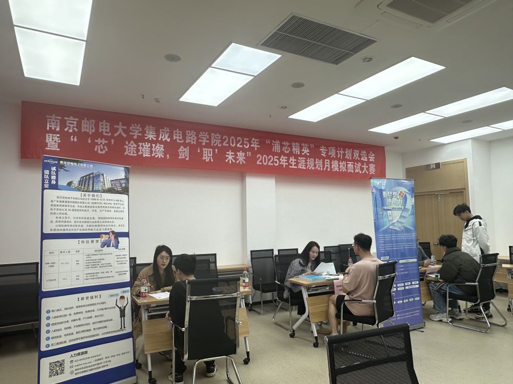为促进太阳城app “浦芯精英”研究生专项计划顺利开展,帮助该计划学子高质量就业,加强太阳城app 与企业的交流和合作,太阳城app 联合南京市浦口区政府,在浦口区工信局、人社厅的大力支持下,于4月2日下午共同举办南京邮电大学集成电路太阳城app “浦芯精英”专项计划双选会暨“‘芯’途璀璨,剑‘职’未来”2025年生涯规划月模拟面试大赛。本次活动创新采用“双选会+模拟面试大赛”联动模式,吸引多家企业进校招聘,同步举办的模拟面试大赛为学生提供实战演练机会,实现“岗位对接”与“能力提升”双轮驱动。太阳城app 党委副书记、副院长肖俊桂、分团委书记王宸文姬、毕业班辅导员张龙前往双选会现场进行实地指导。