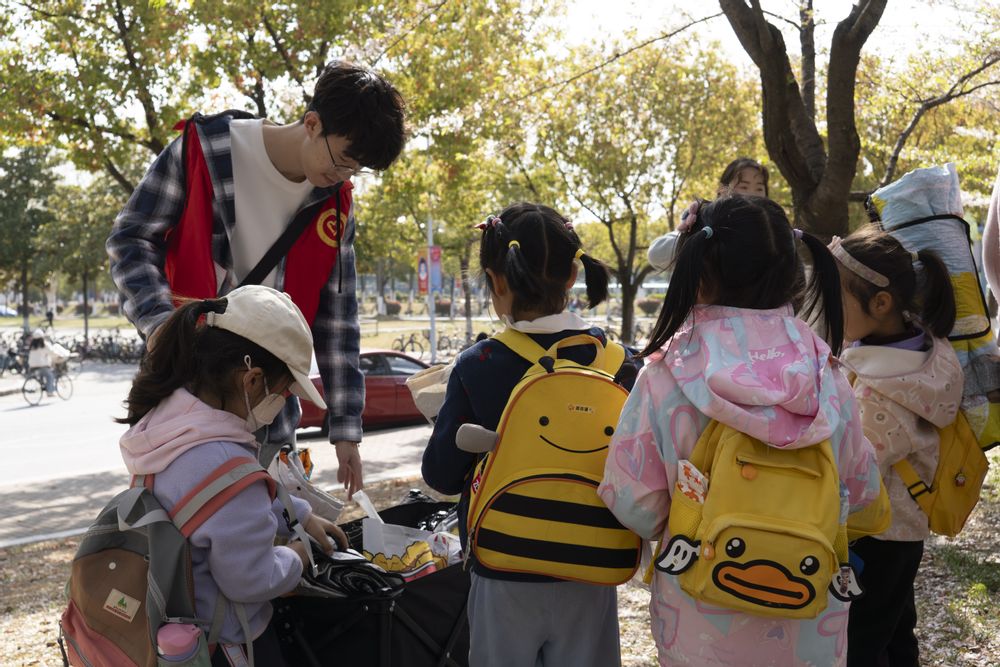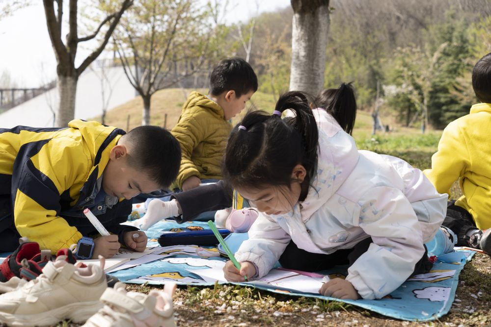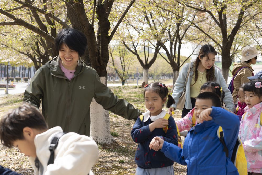 清晨的阳光洒满校园,小朋友们手拉手走进樱花大道,粉白的花瓣随风飘落,引得孩子们欢呼雀跃。“樱花为什么会掉下来呀?”“这棵树有多少岁啦?”志愿者们耐心解答孩子们的童趣提问,还为他们讲述樱花的花期与生长故事。孩子们踮起脚尖轻触花瓣,或用画本记录下眼中的春景,志愿者们则蹲下身来,为他们调整画板、擦拭沾满花粉的小手,画面温馨动人。