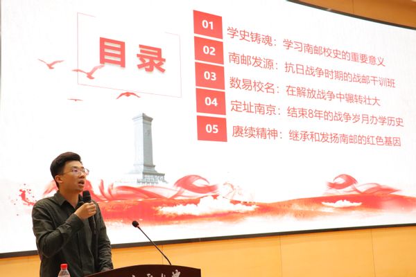 为庆祝南京邮电大学办学83周年,充分发挥学校红色校史文化的铸魂育人功能,更好的继承和发扬学校的红色基因,4月17日下午,南京邮电大学第四届辅导员宣讲团成员范建鹏在图书馆四楼报告厅,面向太阳城app 2024级同学开展了红色校史主题宣讲活动。