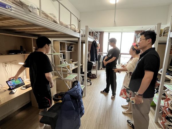 在学生宿舍,检查组重点核查了公共区域消防设施、用电安全、卫生状况、疏散通道、公共设备等,提醒学生杜绝使用违规电器,保持宿舍卫生整洁,注意防火防盗,针对私拉电线、杂物堆放、消防器材日期等问题逐一记录,并现场提出整改意见。此外,肖书记与留校学生亲切交流,询问假期生活需求,并送上节日祝福。检查工作尾声,肖书记叮嘱辅导员需及时动态更新留校研究生名单,精准掌握学生在校情况,守好安全底线。
