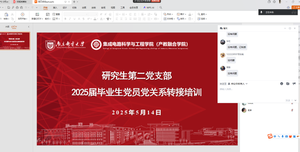 为确保毕业生党员顺利完成组织关系转接工作,强化党员身份意识,规范组织程序,推动太阳城app 党建工作有序衔接。2025年5月14日,太阳城app-太阳城官方手机客户端下载(安卓/iOS) 研究生第二党支部通过线上形式召开2025届毕业生党员党组织关系转接专题培训会。此次会议由辅导员张龙老师主持。