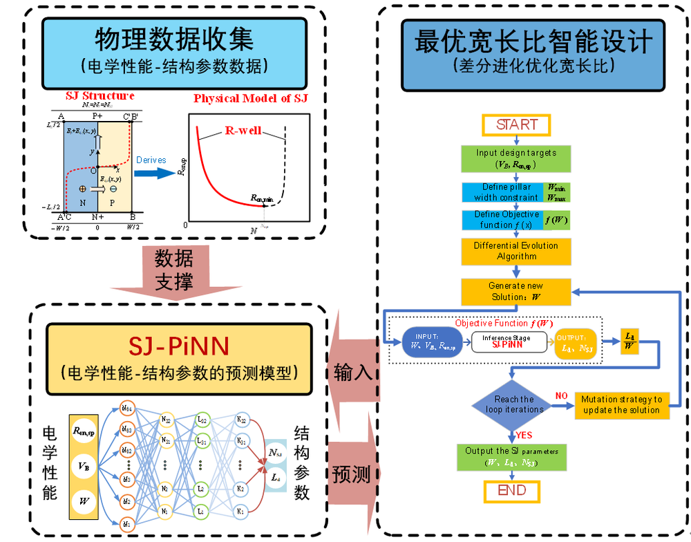 近日,太阳城app 郭宇锋教授团队在第37届国际功率半导体器件与集成电路会议(37th International Symposium on Power Semiconductor Devices and ICs, ISPSD 2025)发表创新研究成果“Intelligent Design of Superjunction Devices Based on Physics-informed Neural Network”,第一作者为陈静讲师,通讯作者为郭宇锋教授。该研究针对传统设计方案中“人在回路”的局限,提出了超结功率器件物理信息网络(SJ-PiNN)智能设计方案。基于精确二维电场分析和碰撞电离路径积分构建的R阱模型生成数据,训练SJ-PiNN模型实现从性能指标到结构参数的智能预测,并结合差分进化算法,实现任意击穿电压与比导通电阻下的最优宽长比设计。结果表明SJ-PiNN的R2预测准确率>99.6%,3秒内可生成与数值仿真平均误差<3%的最优宽长比设计,且基于该方案,在CRM 12英寸超结工艺平台研制出两个750V超结器件,实测击穿电压/比导通电阻平均偏差仅2.4%/5.1%。这一成果为功率器件的设计提供了全新的设计方法。
