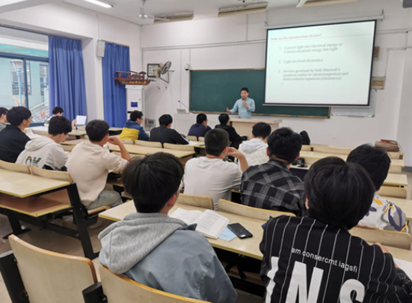 成谢锋教授随机听取新进教师李山的《固态电子器件(全英文)》课程,并认真地对教师课堂表现、课程内容、学生状态进行记录,课后,成谢锋教授与李山老师进行沟通交流,反馈教学评价,提出改进意见,以便促进教学,提升质量。