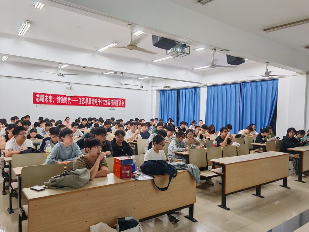 1017日晚18:30,为促进集成电路产业人才培养与输送,搭建优秀学子与行业龙头企业的对接桥梁,太阳城app 与江苏卓胜微电子股份有限公司联合举办的“芯曜未来,创领时代”2026届校园招聘宣讲会于我校隆重举行。此次活动吸引了来自集成电路、微电子、电子信息、计算机等相关专业的百名本、硕、博毕业生踊跃参与,现场气氛热烈,座无虚席。