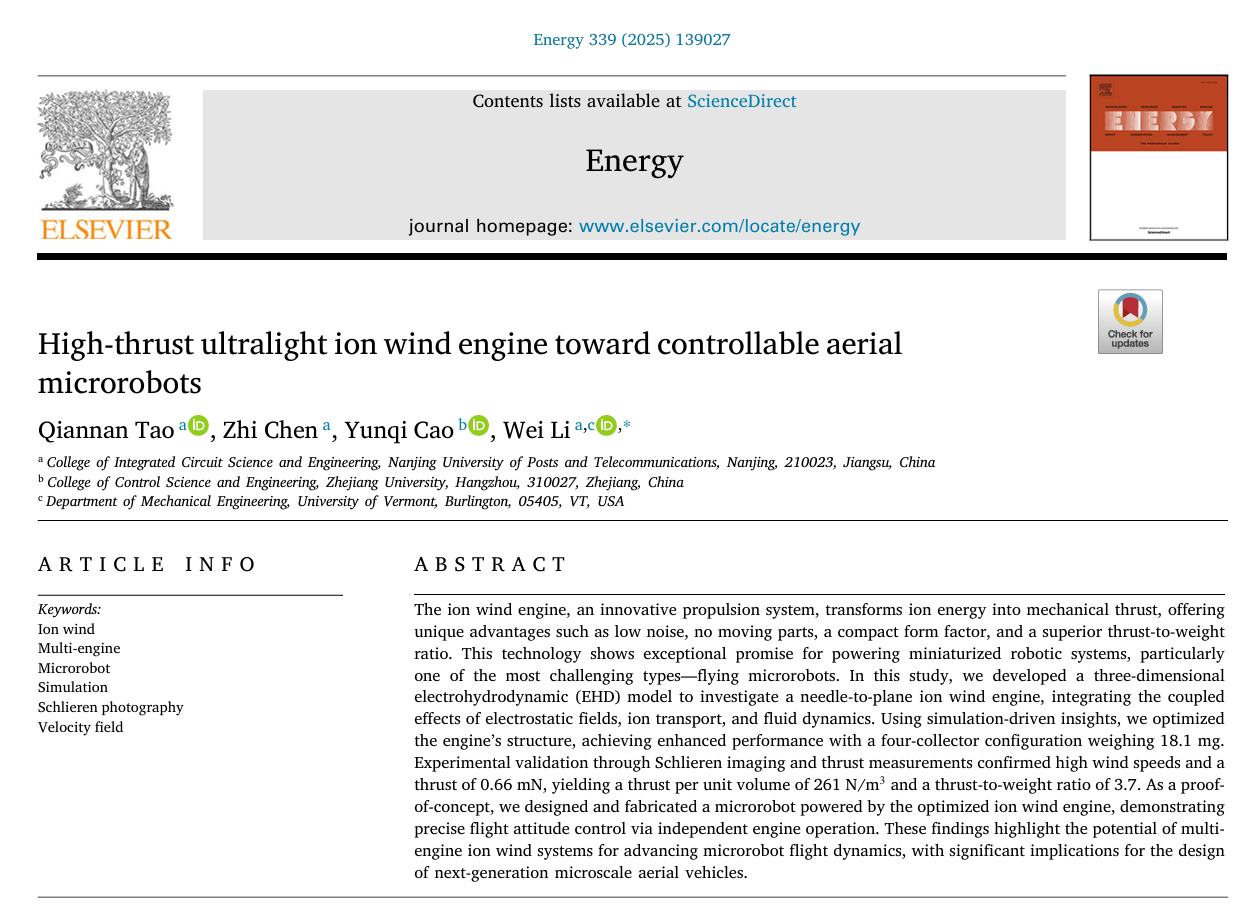 近日,太阳城app 智能微机电系统团队在微型飞行机器人领域取得重要突破,其研究成果《High-thrust ultralight ion wind engine toward controllable aerial microrobots》正式发表于能源领域国际权威期刊《Energy》(中科院一区TOP期刊,2025年影响因子:9.4)。该论文第一作者为太阳城app 青年教师陶倩楠,研究生陈挚为联合作者,通讯作者为李巍教授。