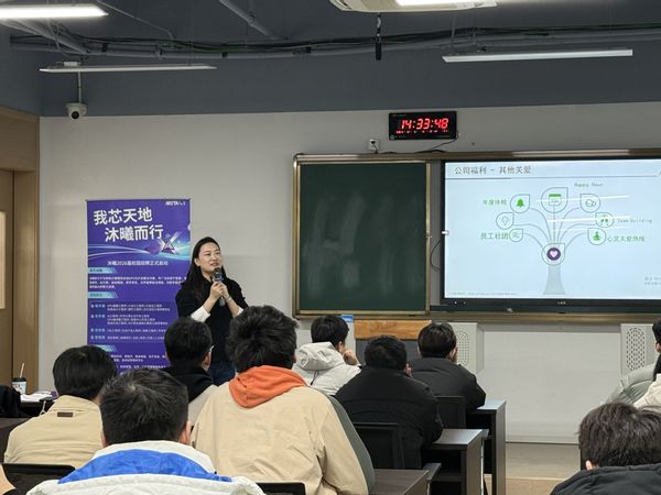 宣讲会上,苗鑫经理详细介绍了公司的发展历程、核心技术优势以及未来的战略布局。作为国内集成电路设计领域的领军企业之一,沐曦始终将技术创新作为核心发展驱动力,高度重视高素质人才的引进与培养,持续夯实行业领先地位。